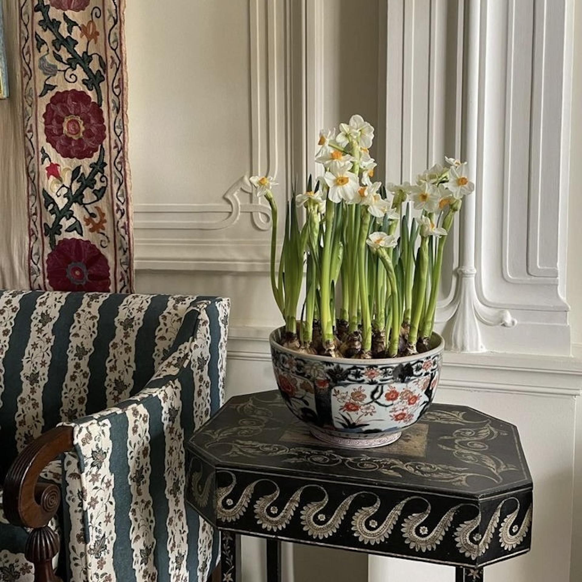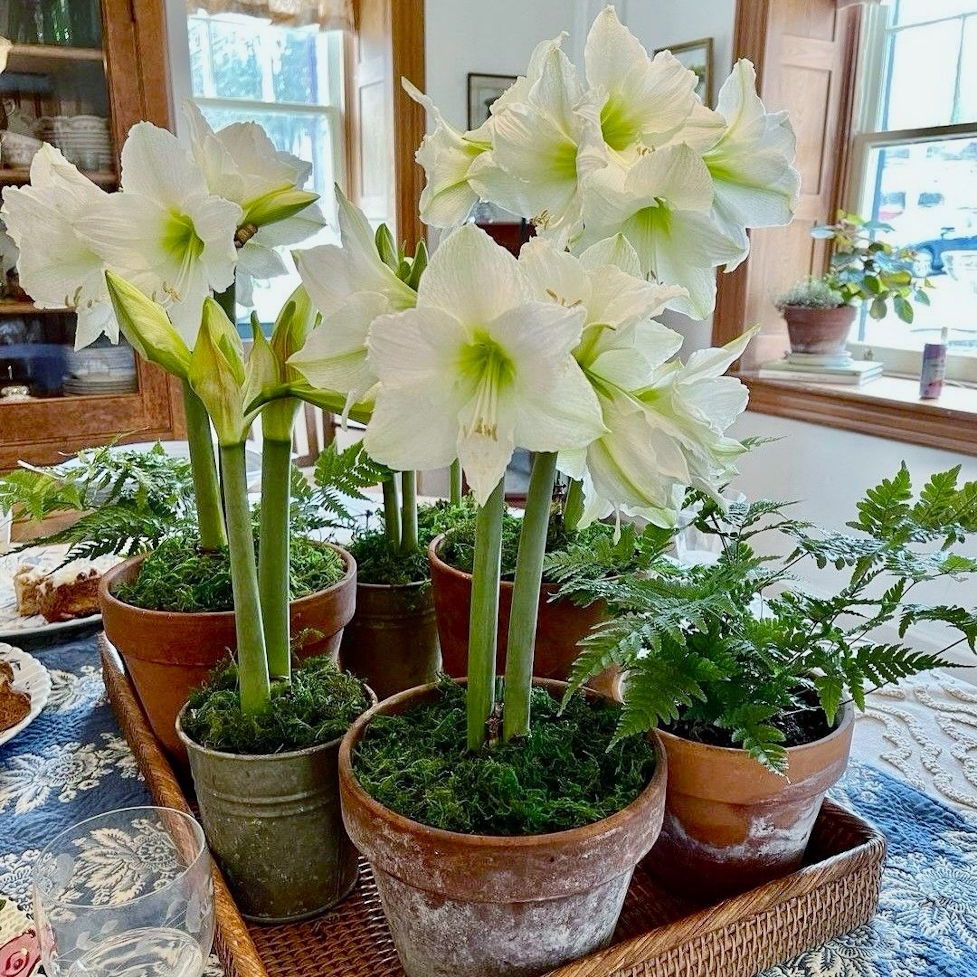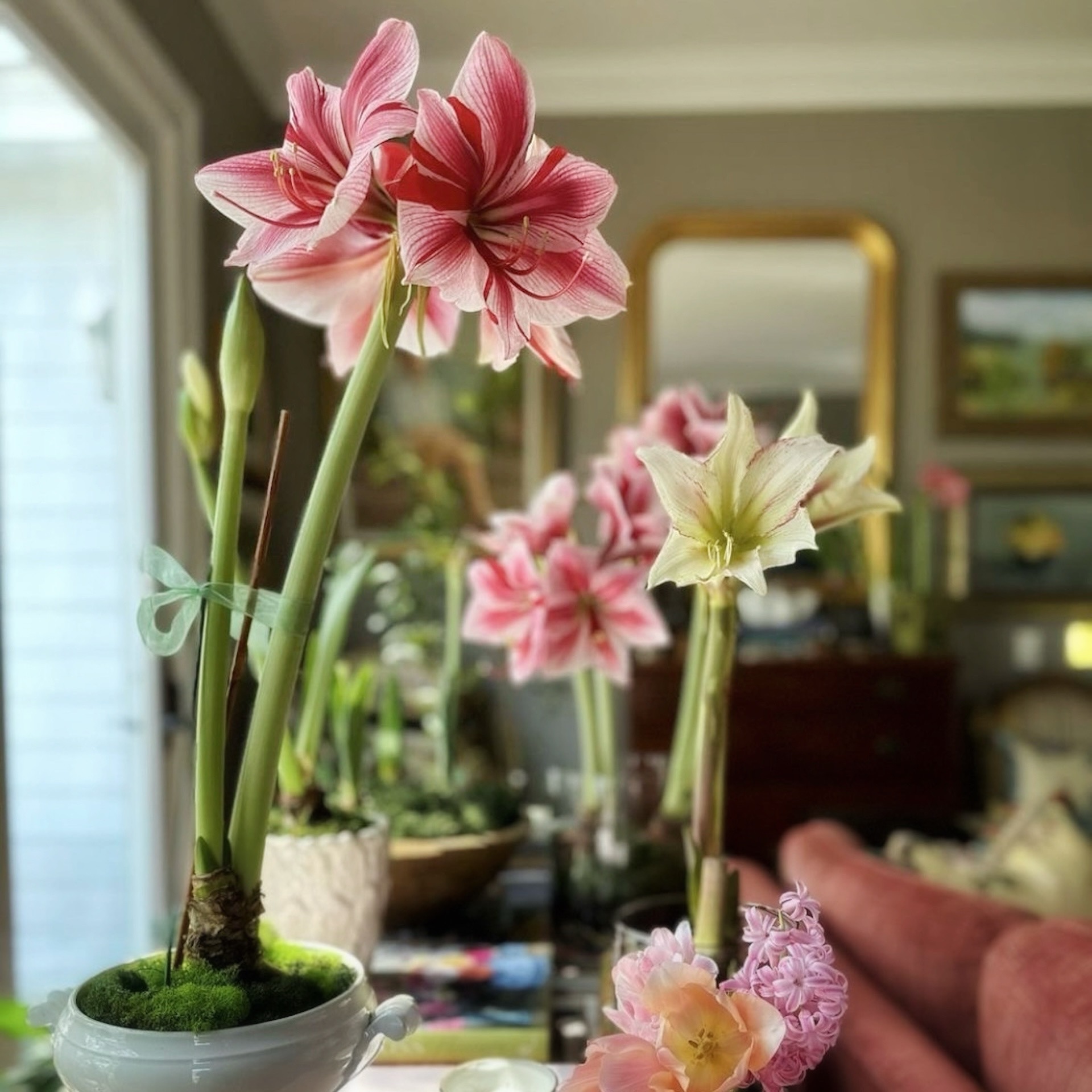 Just in time to beat the winter gloom—we begin Friday January 9th, 16th and 23rd, and 30th- we will pot and arrange for you 4 consecutive weeks of the very freshest and loveliest amaryllis and Narcissi Tazetta imaginable. Each Friday, you will receive rare Amaryllis and paper whites each potted in emerald green clump moss accented with seasonal branches and berries. Some weeks a pale blush “apple blossom” amaryllis in white and blush will arrive, with Chinese Sacred Lilly paper whites, and some weeks a Terracotta amaryllis will arrive accompanied by double cream paper whites. We are always trialing new varieties and hope to show you some flowers you haven’t seen before.