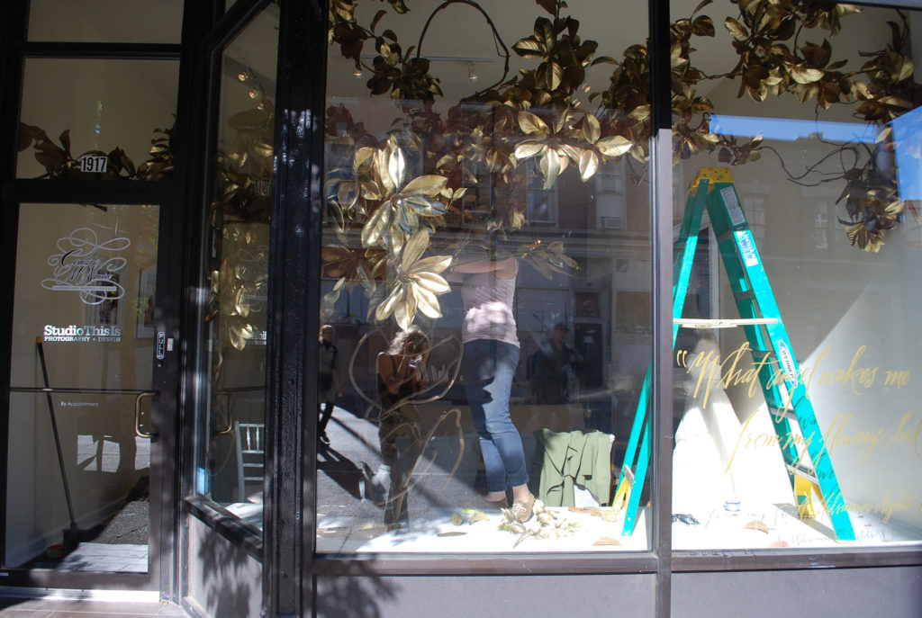 Our glamourous intern Diana strikes a heroic, Artemis as ghostbuster pose. Fragrant camphor vines, camelia and magnolia fill our showroom window.